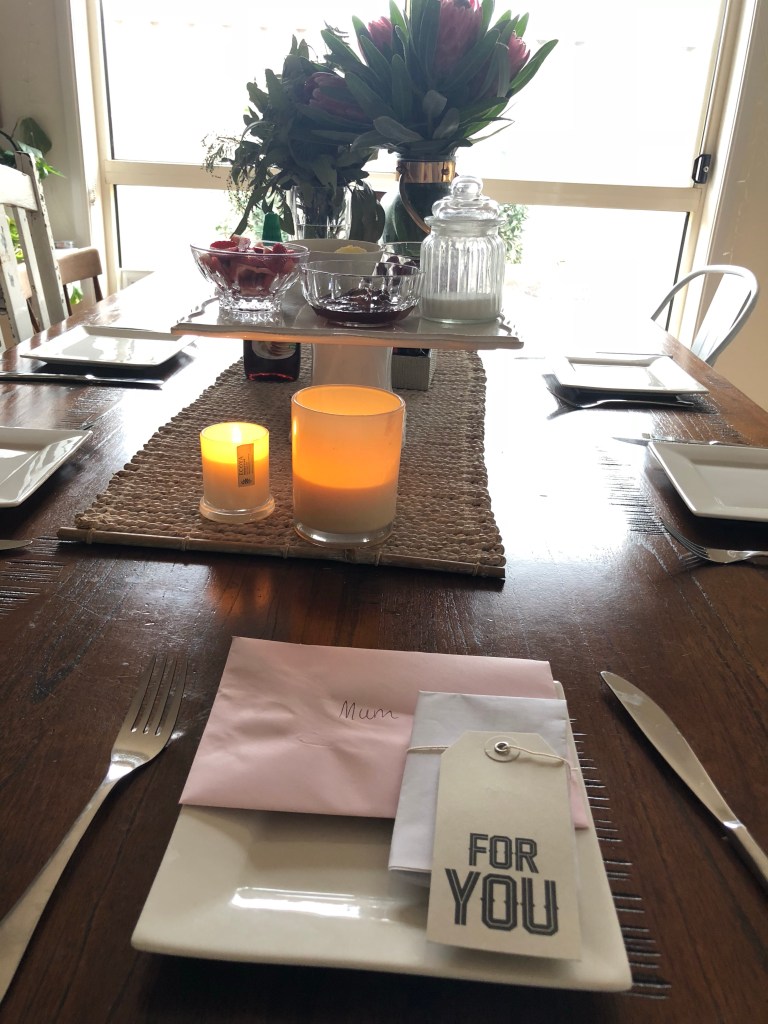 Starting the day slowly with breakfast in bed. We used to pick an assortment of flowers from around the neighbourhood (sorry anyone who lived on our block), put them in a glass of water and set them on a tray next to a burnt piece of toast – “just scrape the burnt parts off”, Mum always used to say. We’d sneak in with a hot cup of coffee, poorly made, and Mum would pretend we had woken her up – when in actual fact she would have been laying there for a full hour thinking “I have sh#% to do, hurry up”. She would eat this as though it was the most delicious thing she had ever eaten and unwrap the terrible gifts we bought from the school Mother’s Day Stall (they’ve improved over the years, let me tell you), “Another bar of soap! Aww you guys”. Or worse we let Dad choose the gift (One year he bought her Daffy Duck leggings. Enough said).
